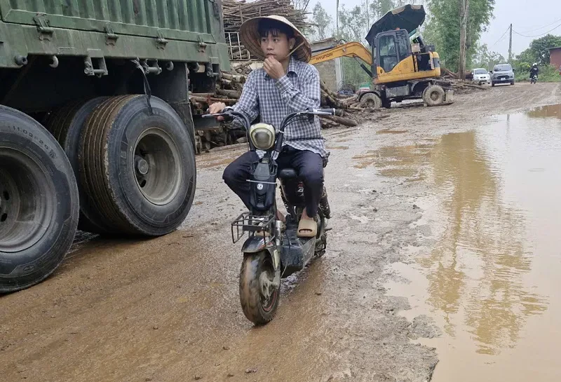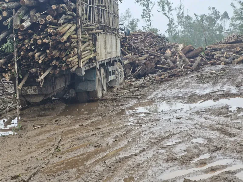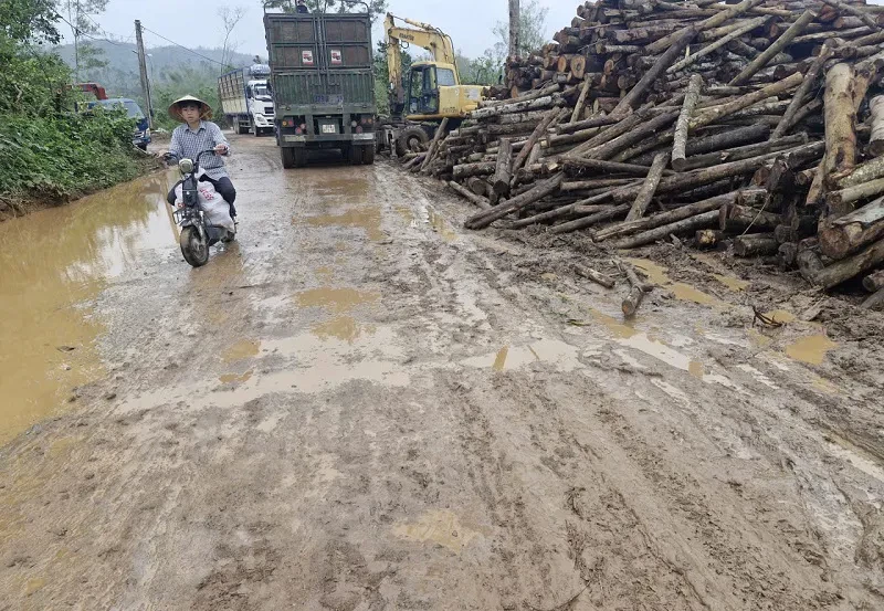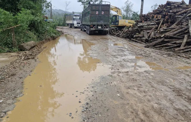 Tại nhiều khu vực thu mua gỗ keo tràm sau mưa bão, lề đường bị xe tải trọng nặng phá hỏng hoàn toàn, dọc đường xuất hiện hàng loạt hố sâu, kéo dài, tiềm ẩn nguy cơ xảy ra tai nạn giao thông.